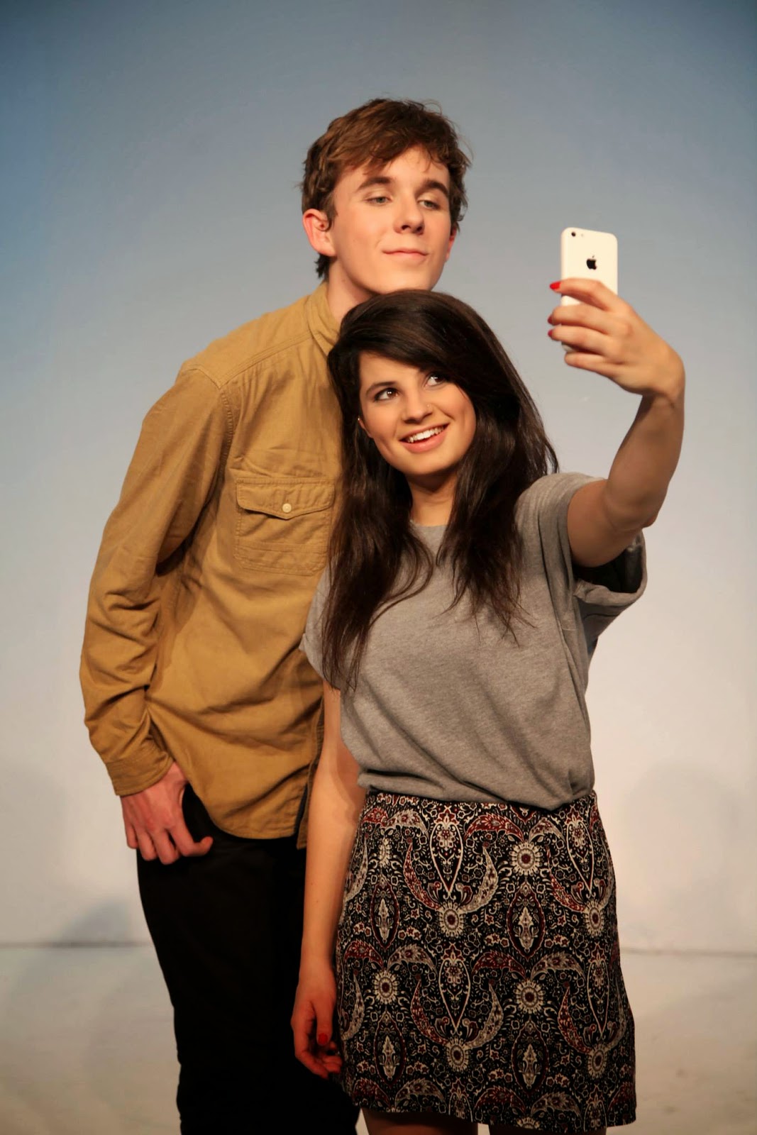 Since modern technology, in particular today's "selfie culture", is one of the most prominent things about this era, and is especially recognisable to our target audience, we decided to include this in the publicity shots so the couple are taking selfies: